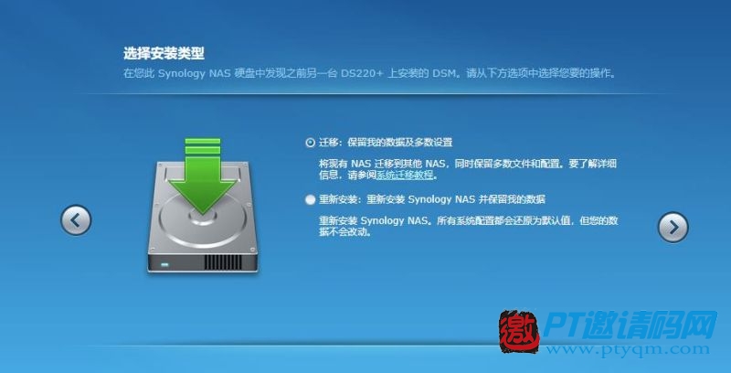 【关键!!!】选择迁移安装类型,第一种是将整体的NAS转移到新机器中,保留用户名等相关信息;第二种则是仅保存数据,安装机器为一台新的NAS,我的目的是把工作和娱乐分开,因此果断选择第二种“重新安装”,随机进入等待界面!