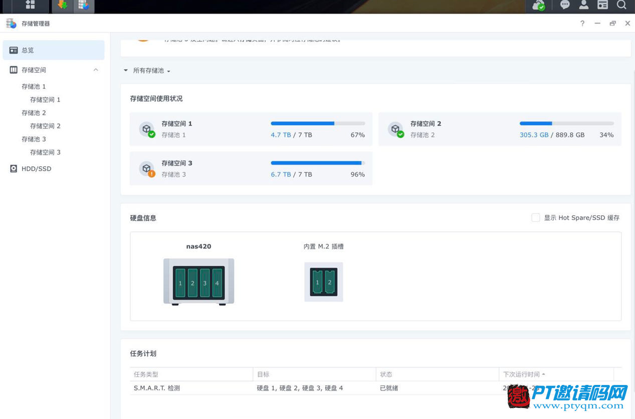 最终420+上的硬盘见下图。硬盘1和2是raid1,硬盘3和4是用来下载的。