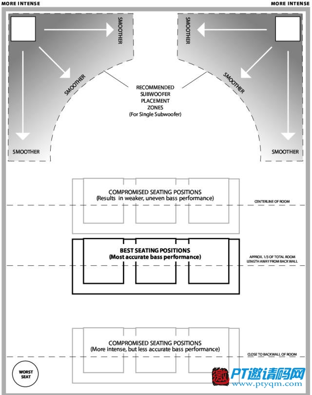 下图是JL AUDIO美国捷力f113低音炮用户手册建议的单炮摆位,更详细地解释了单炮炮位与观众座位的关系。低音炮应摆放在左前方或右前方的灰色区域内,越靠近角落低频越强烈(灰色越深),越往外就越平滑(灰色越浅)。